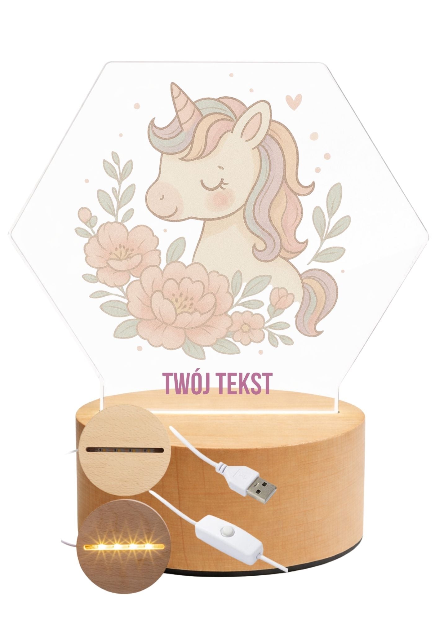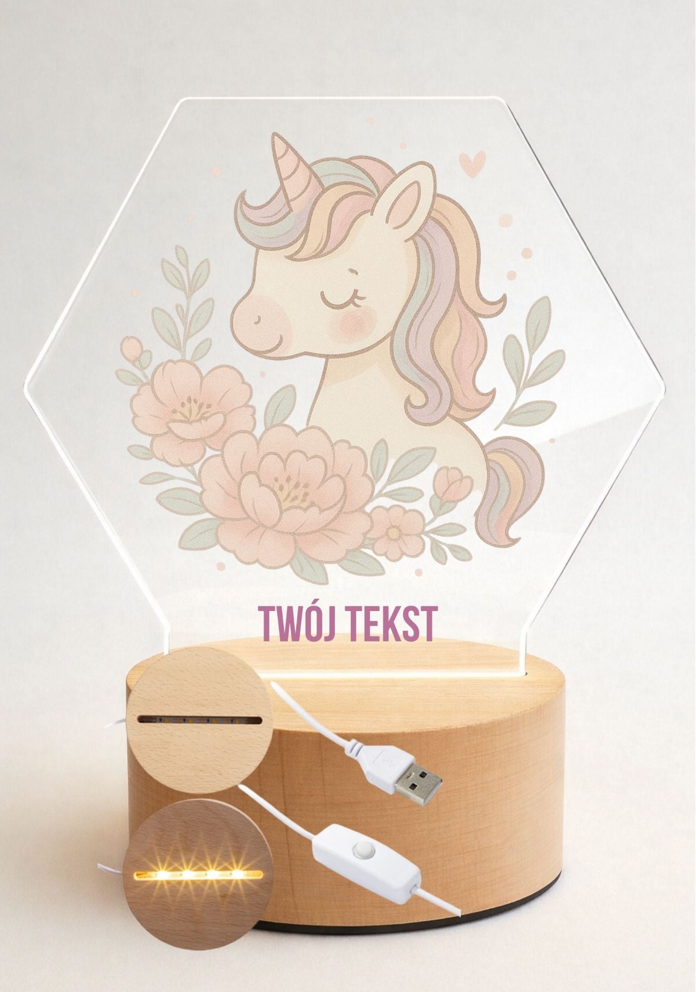 Nowoczesna i stylowa lampka LED z przezroczystej plexi, idealna jako prezent lub wyjątkowa dekoracja pokoju dziecięcego. Każdy wzór wykonywany jest z dbałością o detale, a neutralne światło LED tworzy przyjemny, nastrojowy klimat.